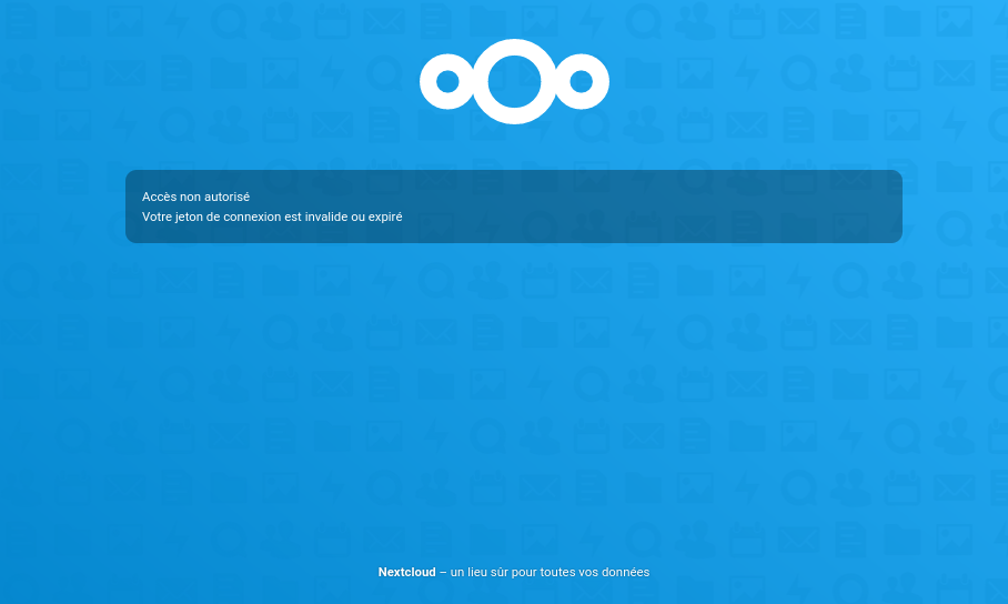 L'autre problème est moins grave, mais j'aimerais comprendre. Sur mon ordi Kubuntu, j'utilise Nextcloud 3.3.4 en appimage. Impossible de me connecter à mon cloud (acloud10) et ce depuis le début. Lors de la tentative de connexion, une page de mon navigateur s'ouvre et m'annonce invariablement : "Accès non autorisé. Votre jeton de connexion est invalide ou expiré". Là aussi, nettoyage des cookies et du cache n'a rien changé.