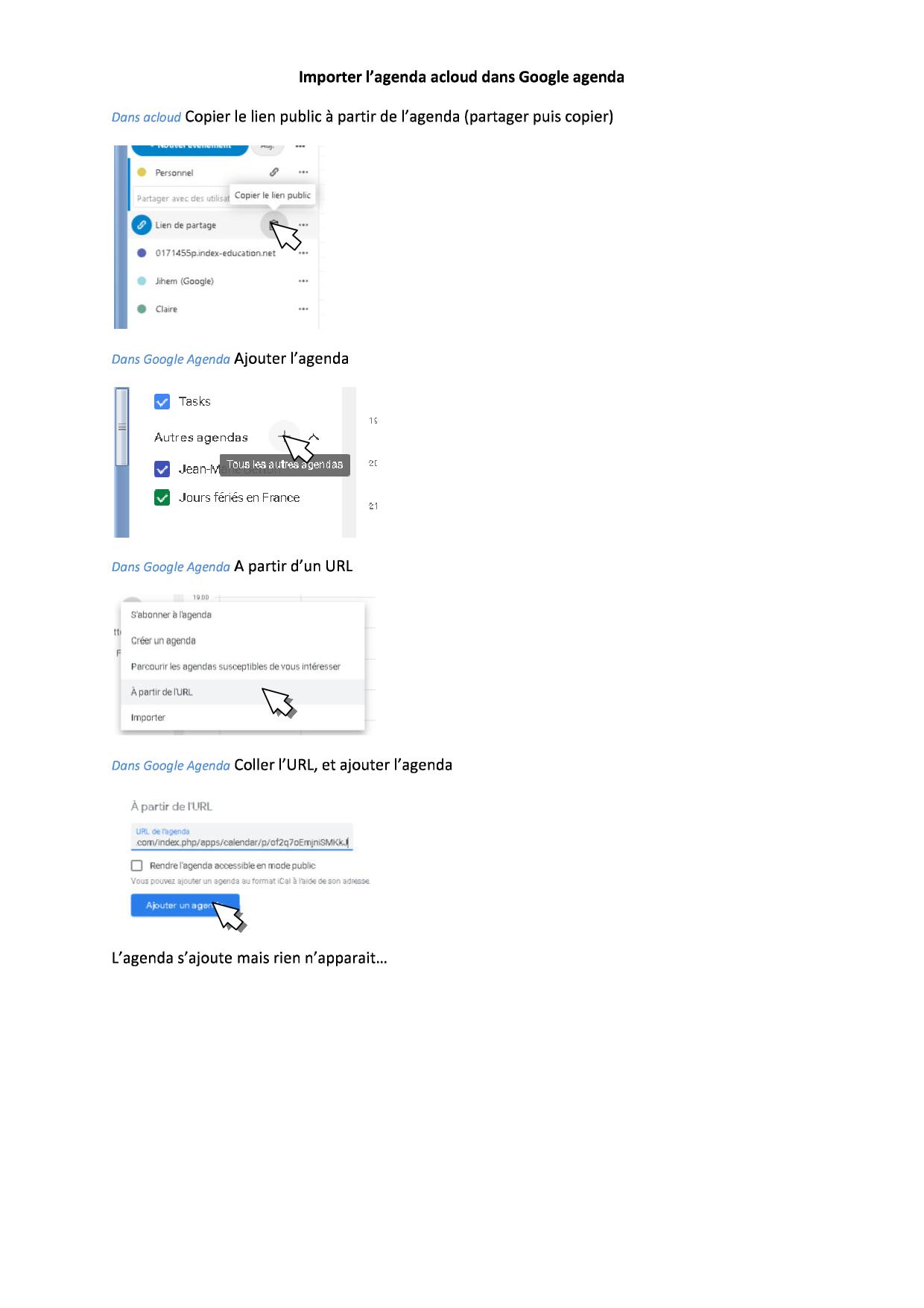 Je suis nouveau sur ce Forum et nouvel utilisateur de Zaclys. J'ai créé un agenda sur acloud4 sur lequel j'ai synchronisé mon agenda professionnel (indexEducation) sans problème. Mais je souhaite également synchroniser l'agenda professionnel de mon épouse qui est sur Google Agenda et ce dans les deux sens. Je n'y parviens pas. je n'ai aucun message d'erreur ni depuis aclouud ni depuis Google Agenda mais rien ne s'affiche dans aucun des deux.