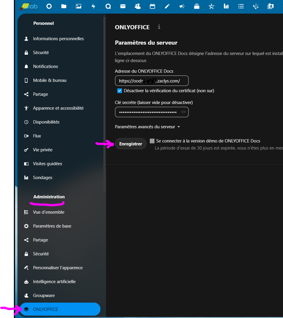 Si vous utilisez OnlyOffice et qu'il ne fonctionne plus après une mise à jour , il suffit de le réactiver :