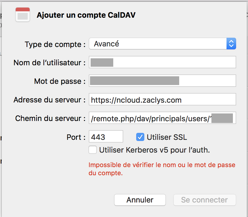 Pas d'erreur dans les identifiants ? Ces mêmes identifiants fonctionnent depuis ncloud.zaclys.com ?