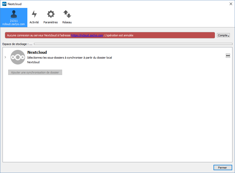 Mais dès que je mets en pause et relance la synchronisation, perte de connexion. Idem si je quitte et relance Nextcloud, ou si je redémarre mon PC.