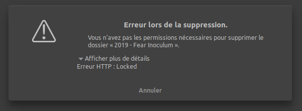 Je viens de migrer de ncloud à acloud. Lors de cette opération, j'ai eu une erreur de time-out http pendant la copie d'un dossier. Celui-ci apparaît dans "Documents", mais est vide et je ne peux pas le supprimer (ni dans Nautilus ni dans l’interface web)