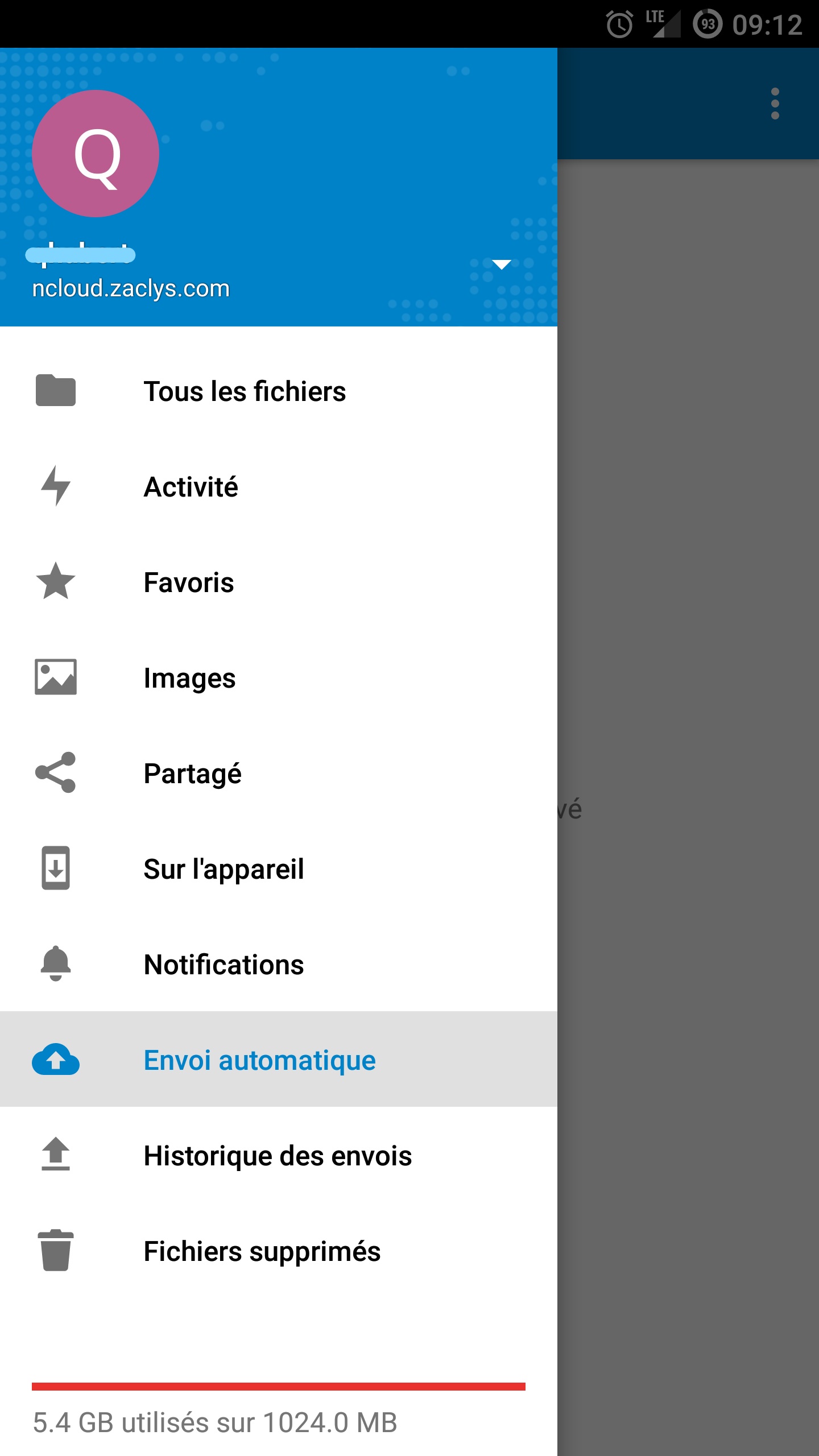Sur la capture d'écran du téléphone, on voit qu'il y a 5.4 Go sur 10Go d'utilisés (c'est normal, ce sont mes documents placés sur le ncloud.zaclys) mais on voit aussi que la barre de progression est en rouge indiquant que les 10Go sont occupés...