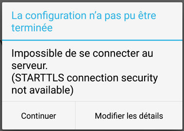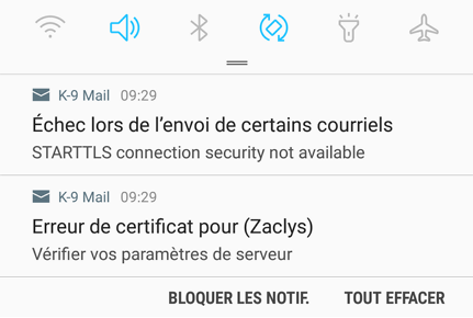 Une erreur est survenue lors de l’envoi du courrier : impossible d’établir un lien sécurisé avec le serveur SMTP « smtp.zaclys.net » en utilisant « STARTTLS » puisqu’il ne propose pas cette fonctionnalité. Désactivez « STARTTLS » pour ce serveur ou contactez votre fournisseur d’accès à Internet.