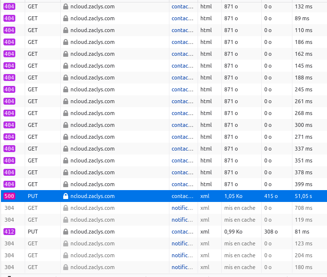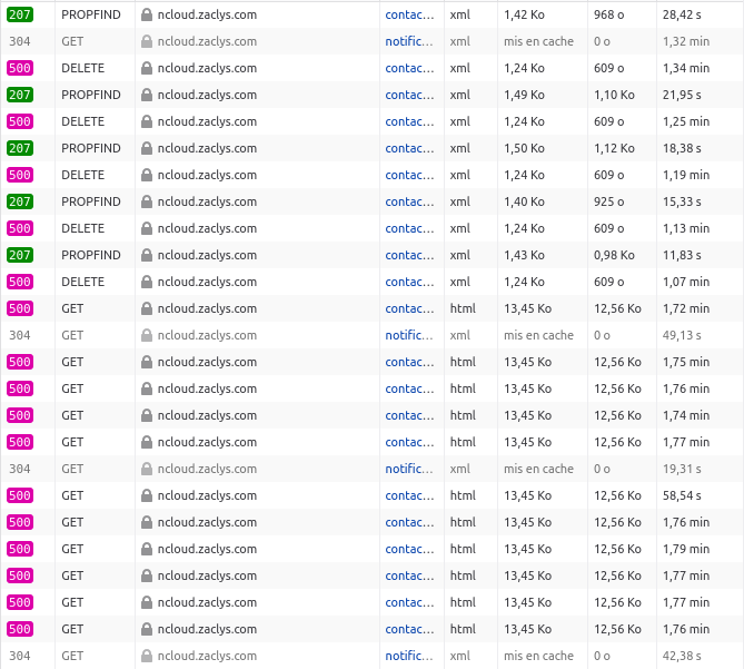 Concernant l'édition/suppression des contacts, c'est de plus en plus compliqué. J'ai plein de requêtes très lentes, voici un screenshot d'hier : Et aujourd'hui, la plupart des requêtes qui n'aboutissent pas (des suppressions et des mises à jour de contacts) : Après des modifications, j'ai souvent cette erreur qui s'affiche : "Le contact que vous essayiez de modifier a changé. Merci de rafraîchir manuellement le contact. Vos modifications seront abandonnées. "