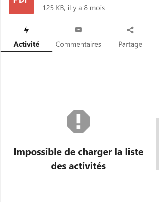 En PJ un tentative d'avoir accès à l'activité d'un fichier individuel qui affiche un message d'erreur.
