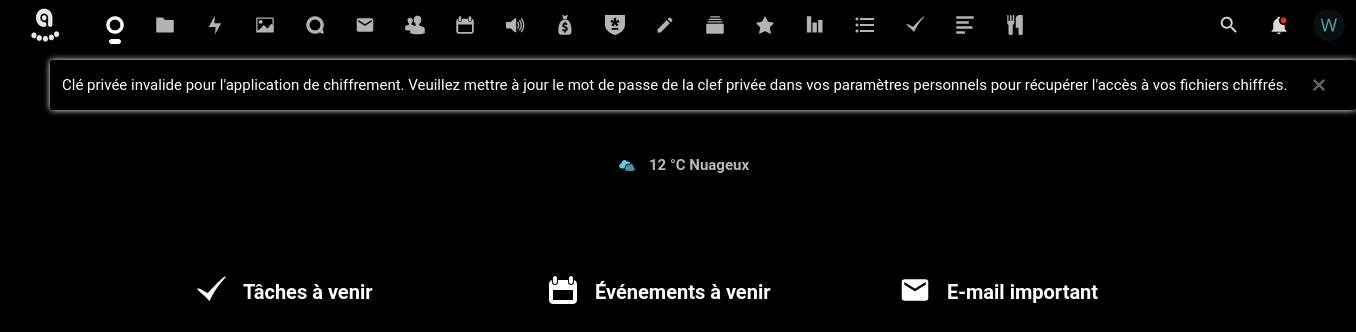 Pour les Notes, j'ai le message "Erreur du serveur Nextcloud : OCA\Encryption\Exceptions\PrivateKeyMissingException".