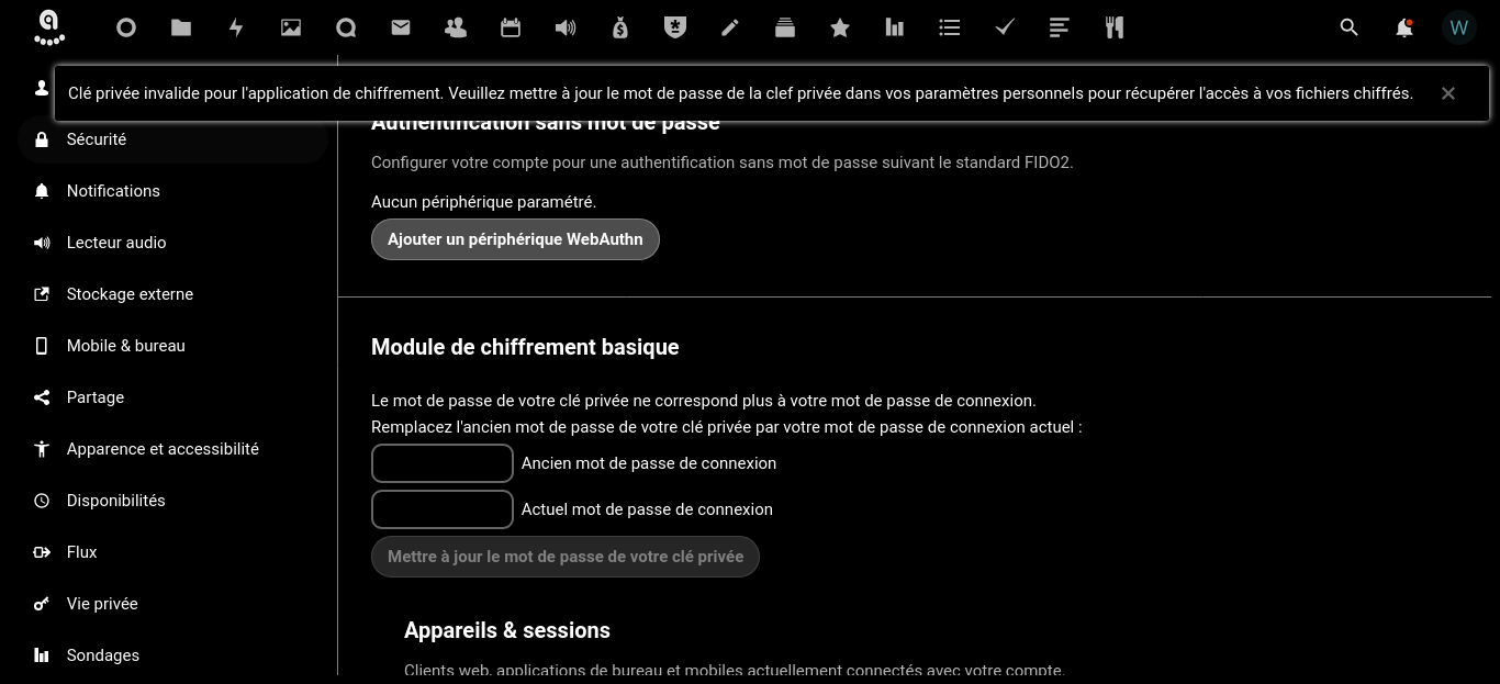 La notification d'erreur suivante s'affiche partout dans mon espace "Clé privée invalide pour l'application de chiffrement. Veuillez mettre à jour le mot de passe de la clef privée dans vos paramètres personnels pour récupérer l'accès à vos fichiers chiffrés."