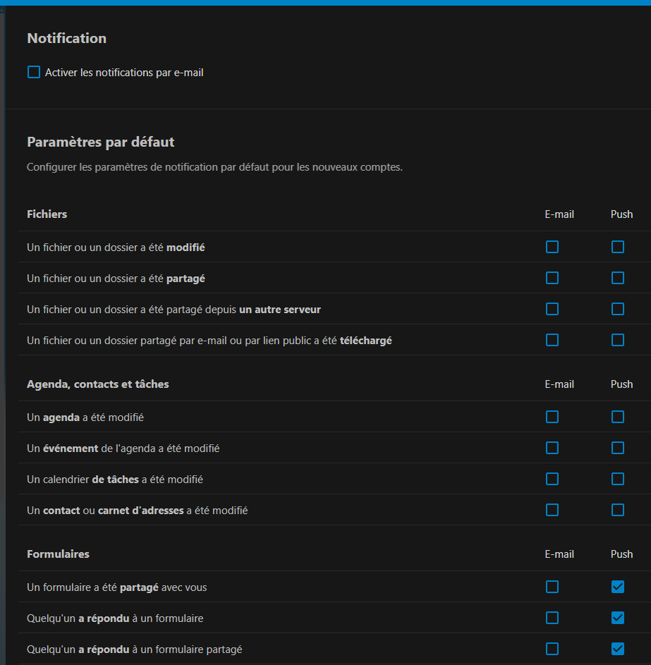 Je viens de vérifier : il n' y a pas de réglages particuliers sur le serveur cncloud pour les notifications et aucune option autres que activer/désactiver les notifications par mail et/ou push (ce que chaque utilisateur peut ensuite paramétrer sur son compte) :