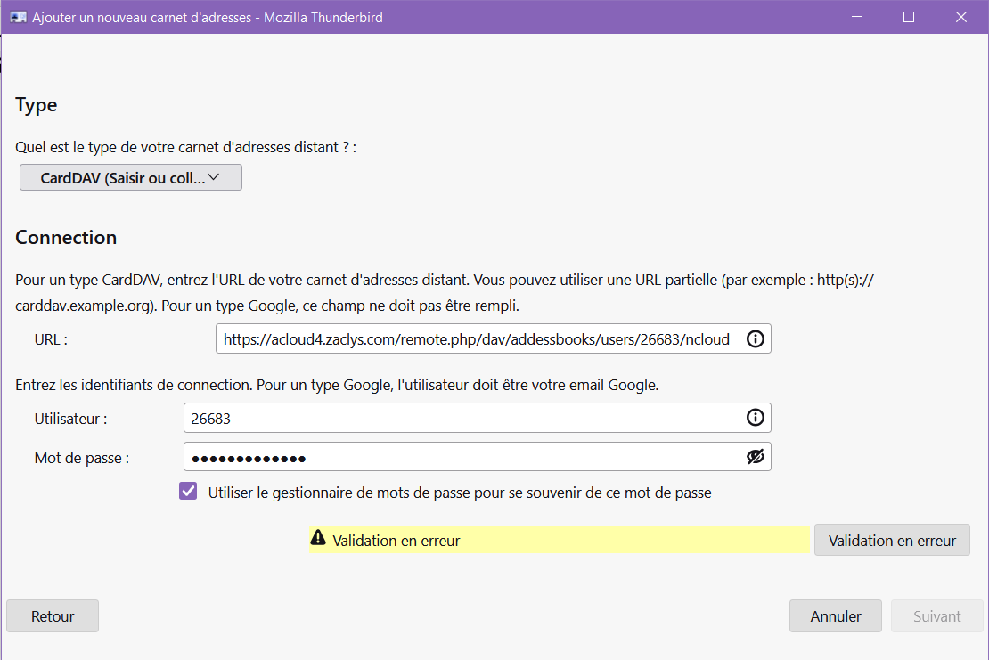 Je suis sur Windows 10 et viens de subir la mise à jour Thunderbird 128.3.3esr Nebula et mon carnet d'adresse sur Cardbook révèle tout à coup un lourd problème de synchronisation avec l'acloud4 de Zaclys. Je redemande la synchronisation dans Cardbook et il ne cesse de redemander le mot de passe.