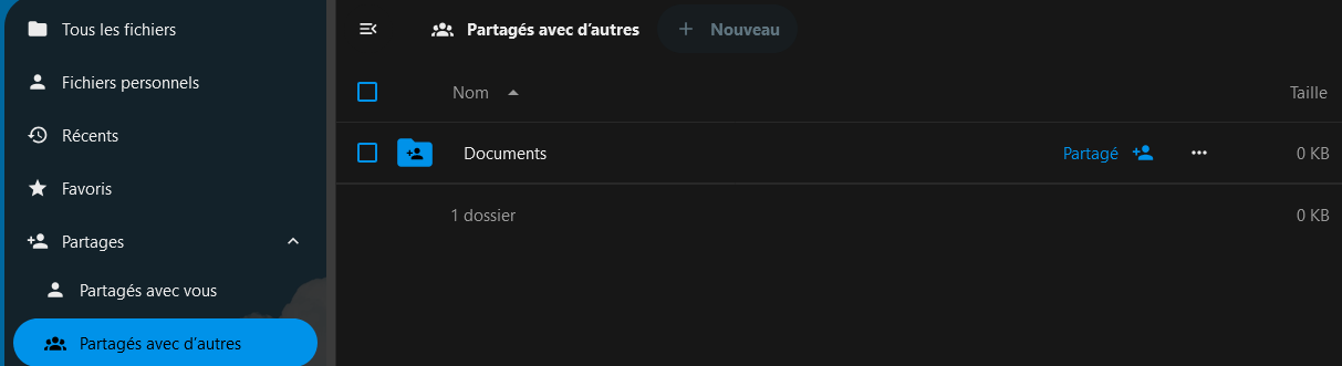 - sur ncloud , créez un nouveau dossier ( mais pas dans le dossier spécial "/Partages")