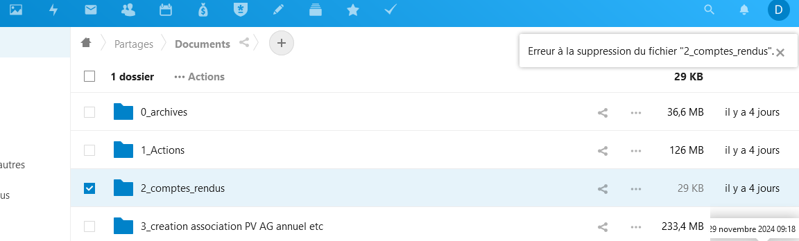 - quand j'essaie de supprimer les documents que j'avais copié dans Partage > Documents, il y a une erreur. Pourtant il existe bien puisque j'arrive à le télécharger sur mon PC :)