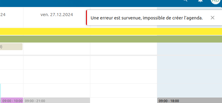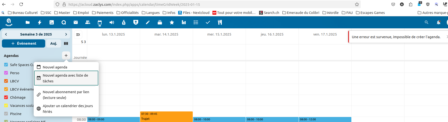Lorsque je fais + Nouvel agenda (avec ou sans tâches) --> j'obtiens le message d'erreur suivant :