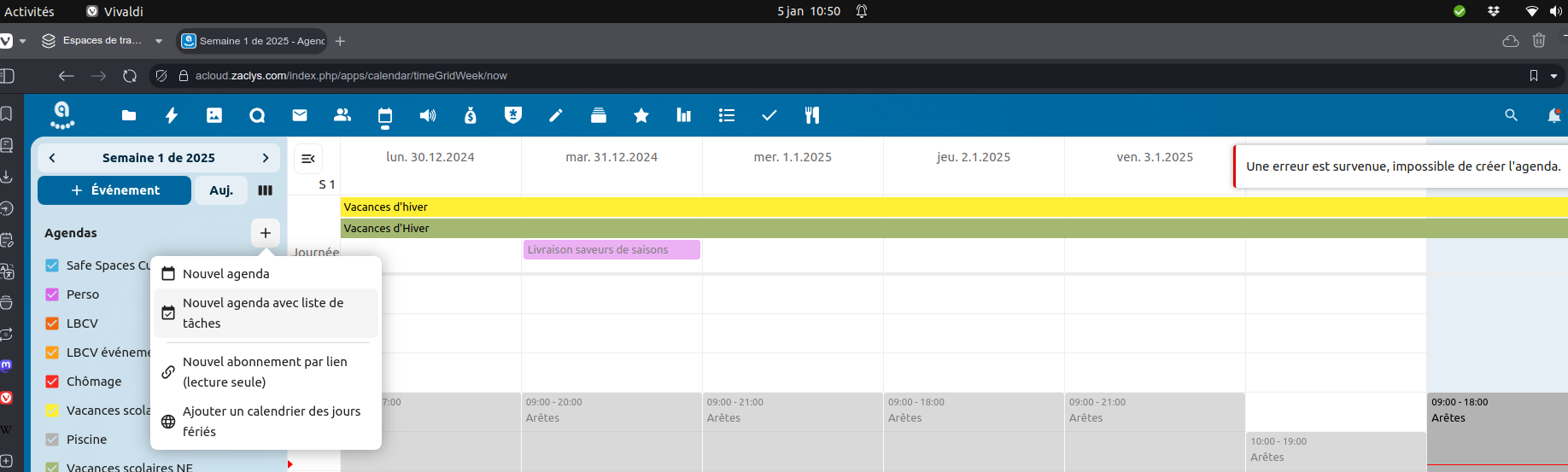 Depuis quelques jours depuis la vue calendrier de mon navigateur (firefox) https://acloud.zaclys.com/index.php/app ... idWeek/now