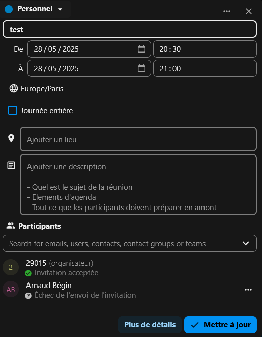 Le mail fonctionne, c'est l'invitation du calendrier qui est bloquée, que l'item soit ajoute par davx5 ou directement sur nextcloud, l'invitation ne part pas.