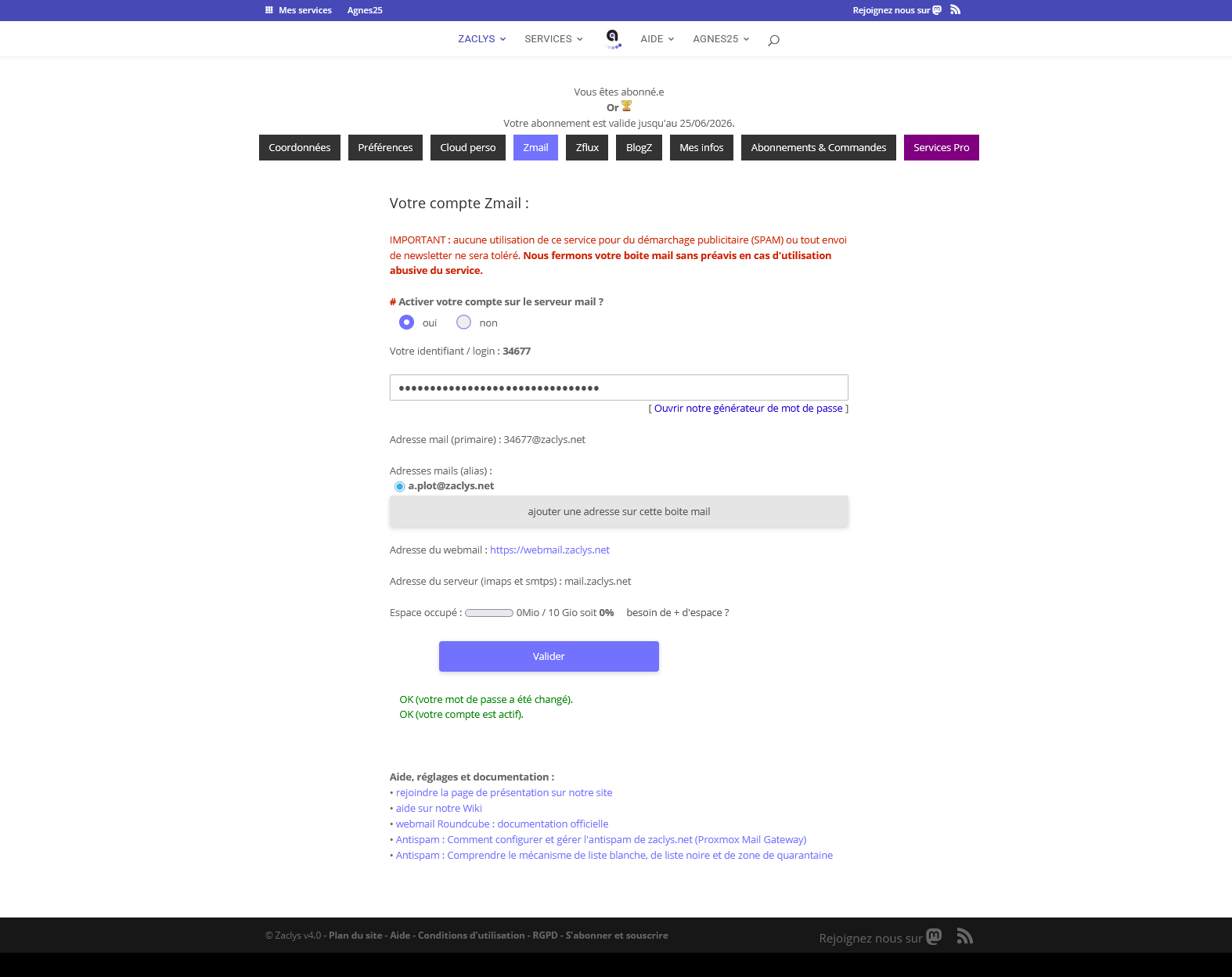 Pour configurer et activer la boite mail, c’est sur le site www.zaclys.com dans « mon profil » , onglet mail