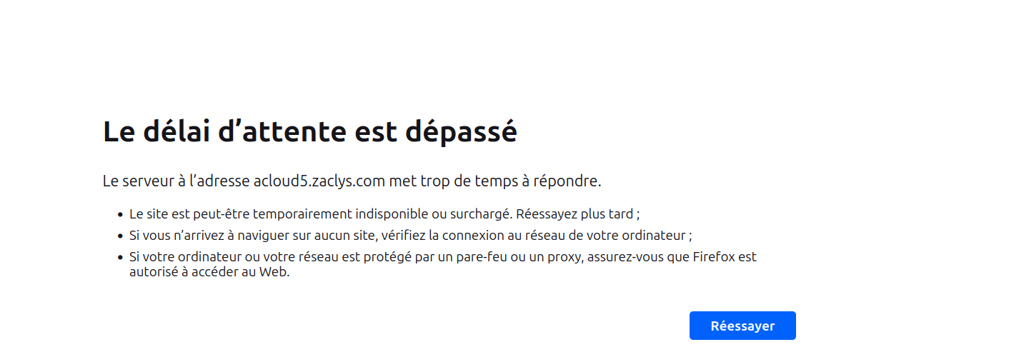 Depuis hier je ne peux plus accéder à acloud5 (cf. copie d'écran), je peux toujours me connecter à zaclys, mon compte est valide jusqu'en décembre, l'appli de bureau et l'appli mobile semble fonctionner correctement.