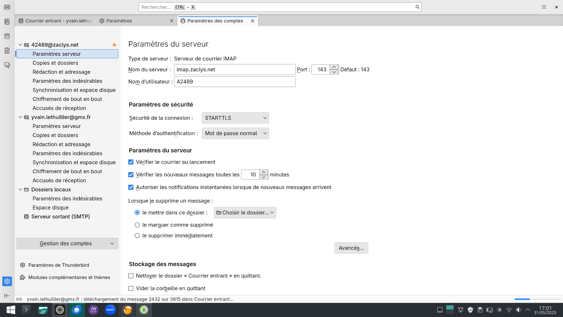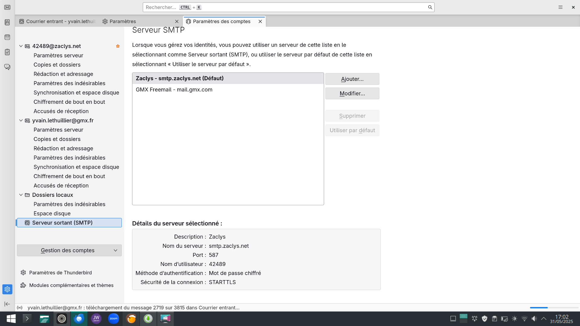 Impossible configurer zmail sur thunderbird