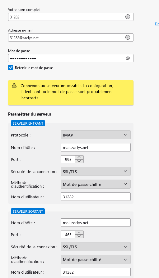 IMPORTANT : si vous avez fait plusieurs essais, le serveur mail zaclys peut se mettre en sécurité et vous bloquer pendant quelques minutes. Patientez et réessayez plus tard. évitez également les VPN.