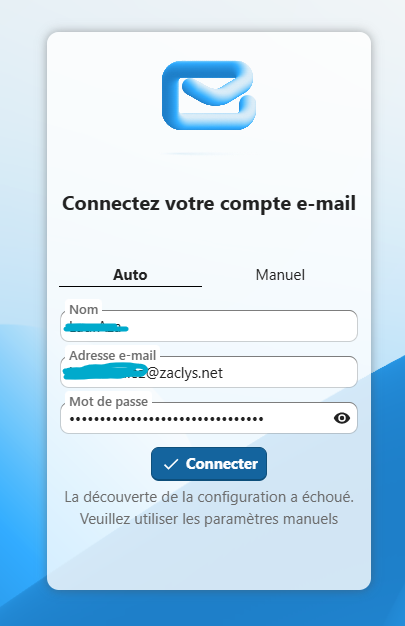 Le nom et l'adresse mail sont préremplis à partir des informations de mon compte Zaclys, et j'ai essayé avec mon mot de passe Zmail et mon mot de passe Zaclys.