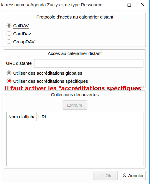En réalité, au moment de configurer manuellement la ressource DAV, dans la petite fenêtre qui s'affiche après avoir cliqué sur "Configuration du Serveur", il faut absolument cliquer sur "utiliser des accréditations spécifiques" et entrer ses identifiants zaclys, sinon le logiciel ne parvient pas à trouver les agendas! En espérant que cela pourra aider quelqu'un
