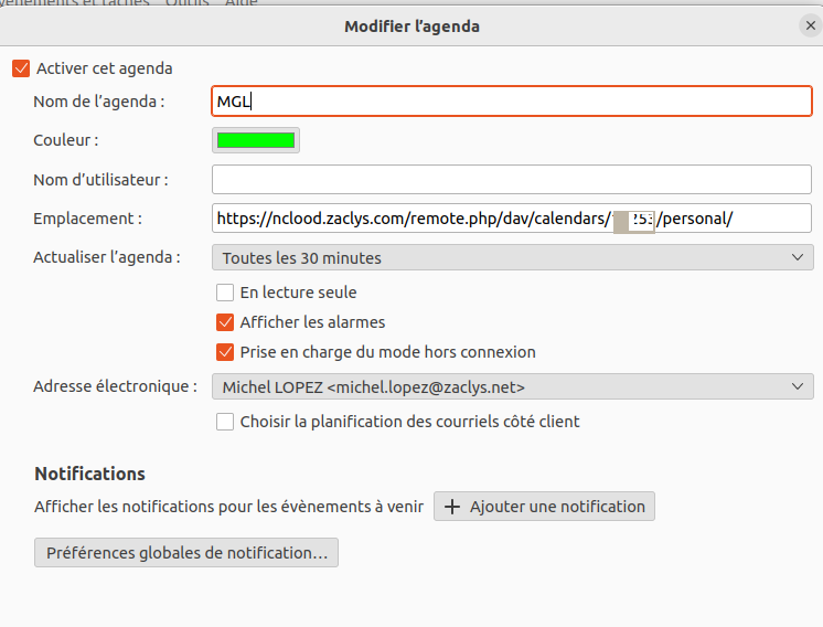 Comment sont configurés les calendriers dans Thunderbird ? Le mieux serait des captures d'écran en prenant soin de masquer les informations sensibles.