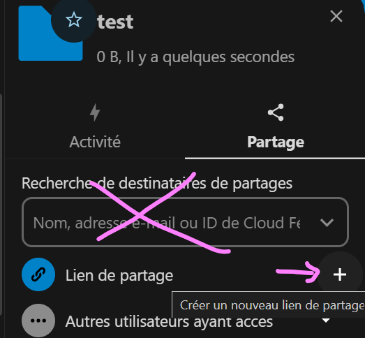 Puis dans le volet de partage , il ne faut PAS utiliser le champs de saisie "mail" (qui permet un partage avec d'autres utilisateurs abonnés de ce serveur) , il faut au contraire utiliser "Lien de partage" : le bouton "+" la 1ere fois pour créer ce lien de partage :