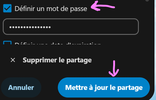 Le 2nd bouton permet de configurer ce partage : vous pouvez y préciser les droits (par défaut : uniquement en consultation) et le mot de passe requis pour les visiteurs qui est obligatoire par sécurité (sauf sur un serveur nextcloud dédié en location) :