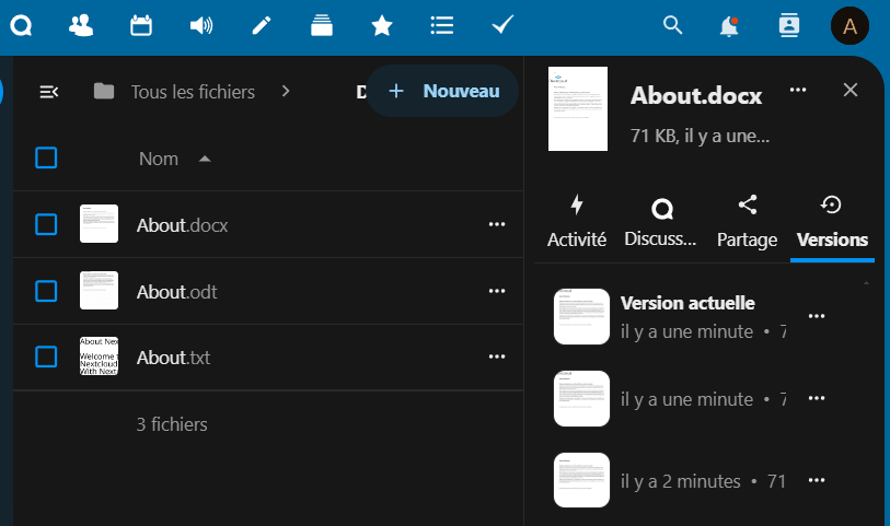 Sous nextcloud on peut accéder directement aux versions antérieures via le bouton "..." à droite du fichier, puis "Détail / Version" :