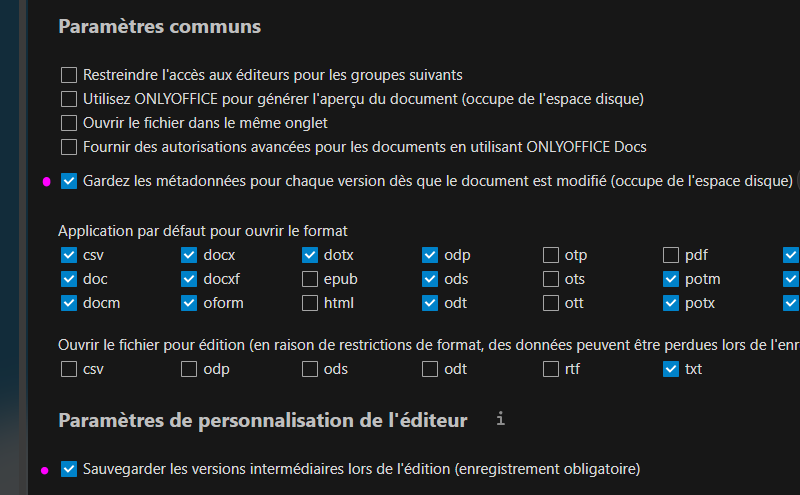 2/ Si vous utilisez OnlyOffice, dans le menu "fichier" / "paramètres avancés" de Onlyoffice , vérifiez ces options pour le fichier concerné :