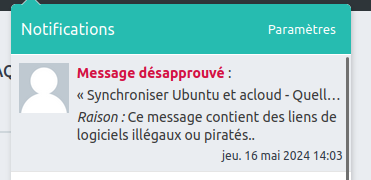 Je ne comprends pas, j'ai envoyé hier un message ou je faisais part de mes investigations suite aux difficultés rencontrées. Et je n'ai pas souvenir d'avoir mis un lien quelconque, et si cela avait été le cas, certainement pas un lien illégal ou piraté ! (cf. copie d'écran de la notification reçue)