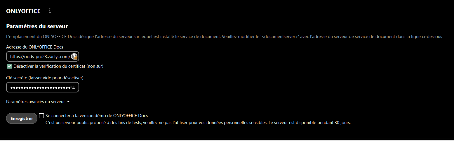 Malheureusement non, les fichiers ne s'ouvrent pas dans nextcloud, quand on clique il propose le téléchargement et dans les paramètres d'administration, je n'ai plus accès aux paramétrages d'onlyoffice pour les formats de fichiers, utilisateurs et groupes...