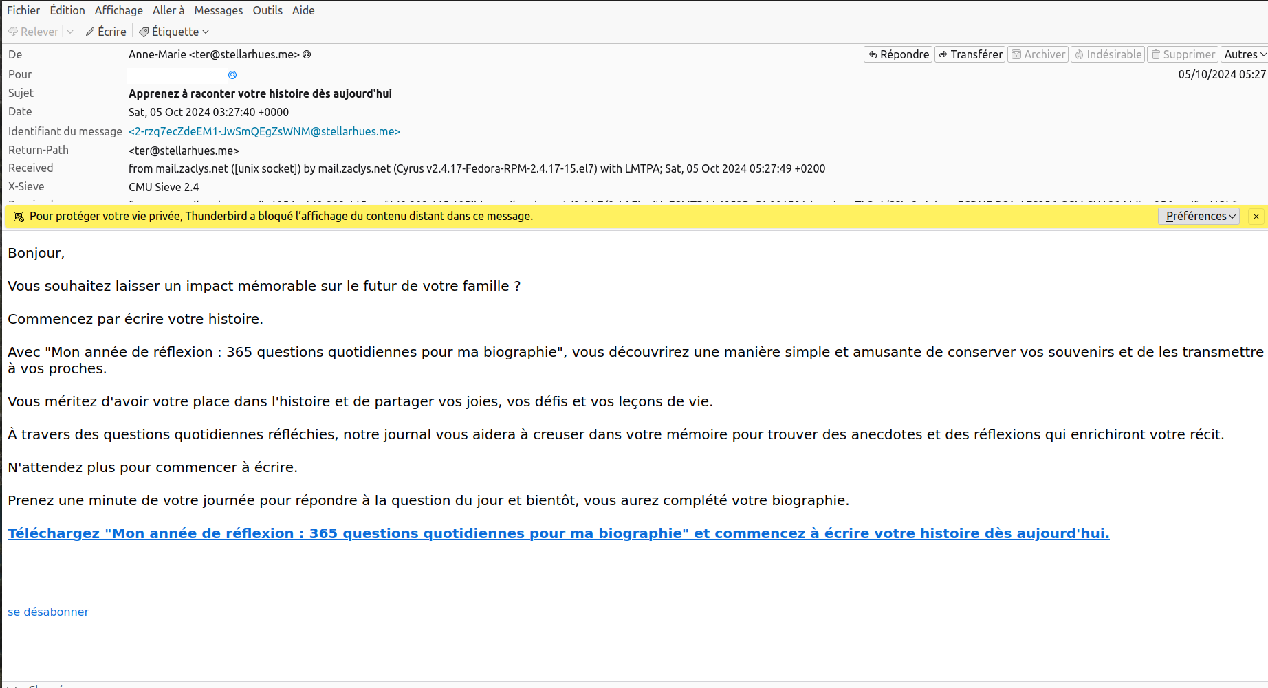 Ci-joints les domaines que j'ai bloqué sur Proxmox ainsi qu'un exemple de mail reçu.