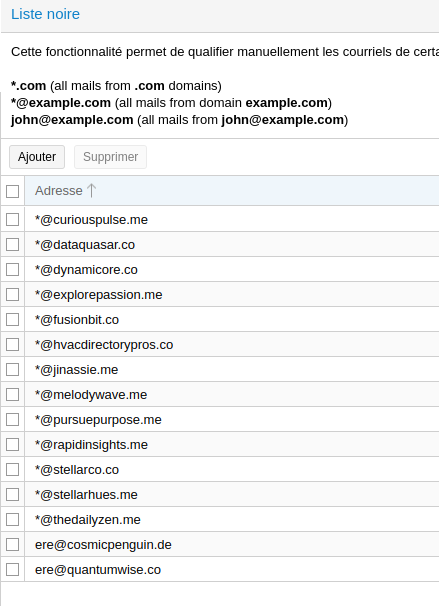 Depuis samedi dernier je reçois de nombreux spam. J'ai ajouté les domaines concernés dans la blacklist de mon interface Proxmox , mais je reçois encore de nouveaux messages car les noms de domaines changent tous le temps. Avez-vous moyen de bloquer ces messages?