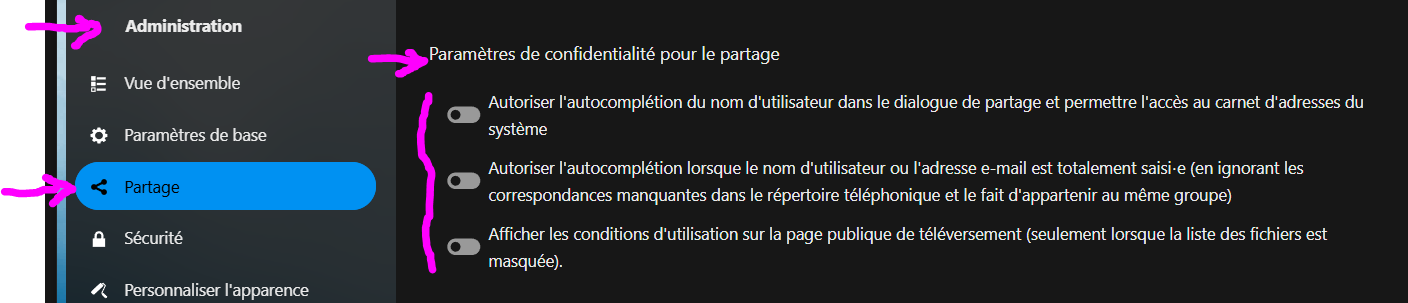 puis dans la partie "Administration" du menu de gauche , sous menu "Partage "