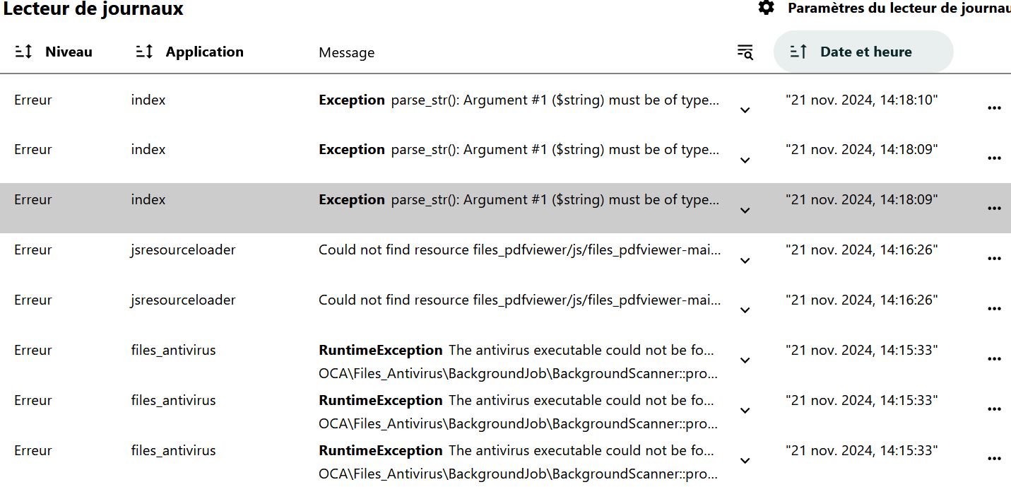 - pour les erreurs PDF Viewer : c'est un bug sur la dernière version de nextcloud , il faut attendre un correctif