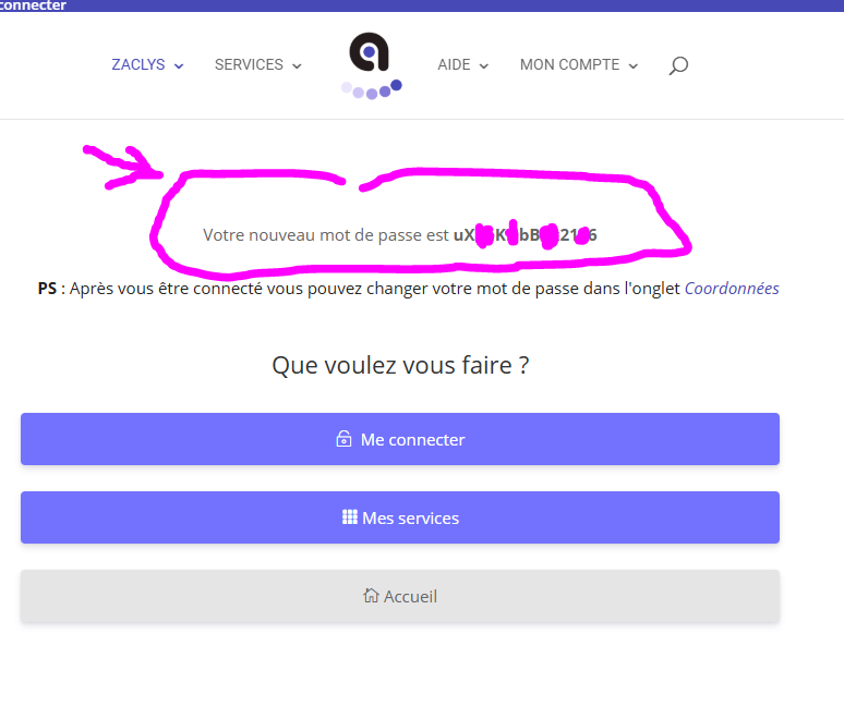 ATTENTION : un nouveau mot de passe temporaire apparaitra à l'écran, merci de le noter pour vous connecter, vous pourrez ensuite le changer dans la rubrique -Mon profil-