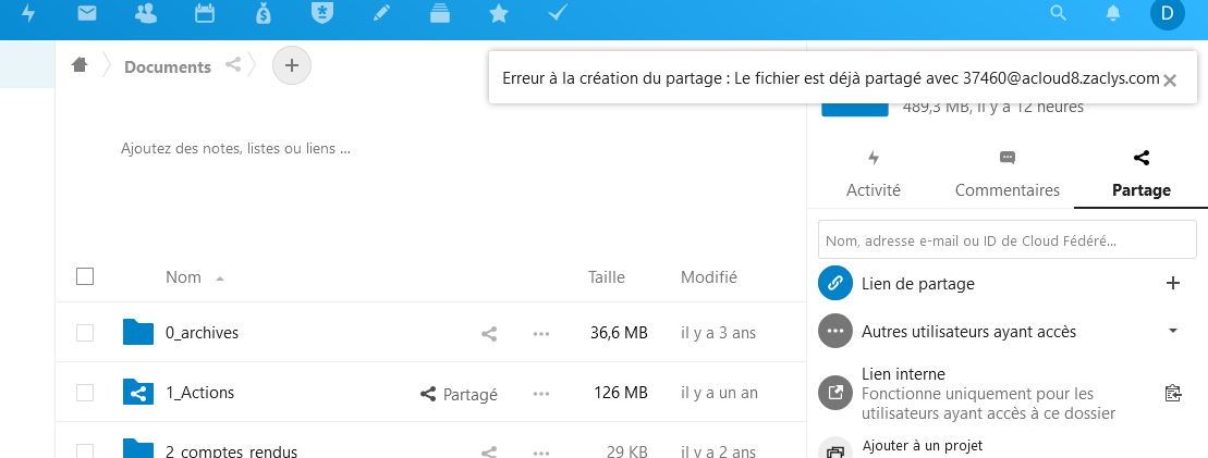 - quand je partage le dossier Documents entier, il me dit qu'il est déjà partagé avec acloud