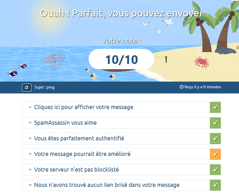 Je viens de tester mon adresse mail sur le site de Mail Tester ( https://www.mail-tester.com/ ). Certains des résultats me surprennent. Notamment, les résultats liés aux clés me donnent une note négative bien que la note globale soit plutôt bonne. Voici ces résultats :