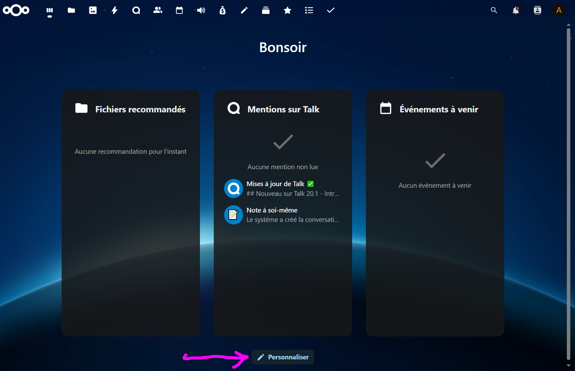 Pour configurer des paramètres globaux empêchant la personnalisation du tableau de bord dans Nextcloud :
