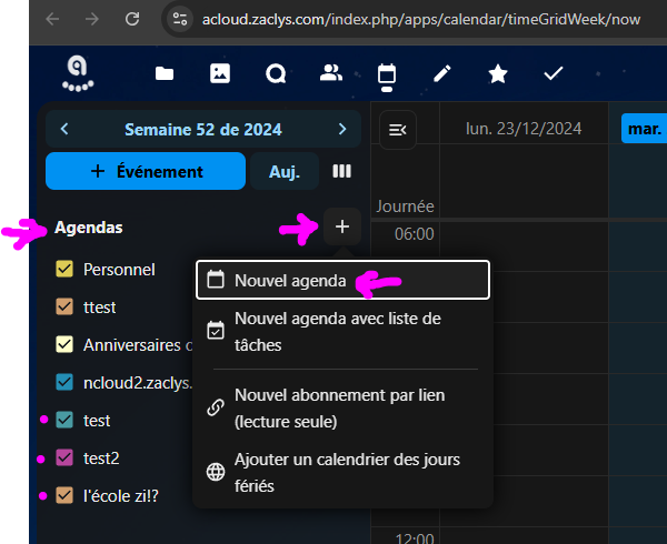 Oui, je suis bien ce chemin. J'entre ensuite le nom souhaité pour l'agenda et valide avec la flèche.
