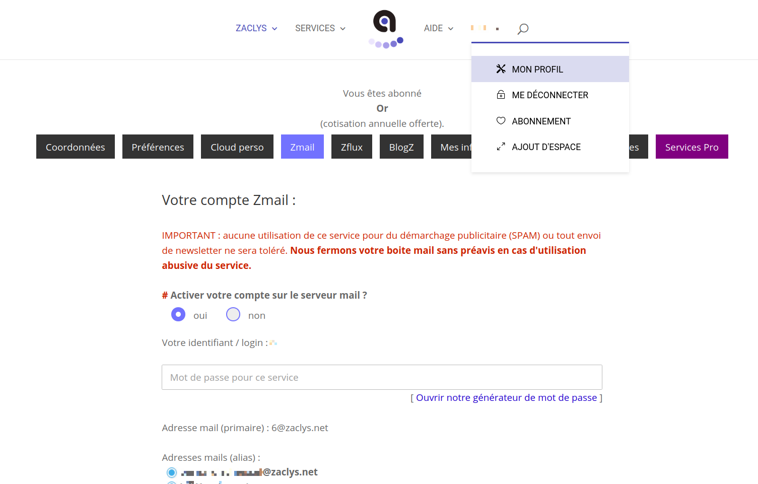 Sur zaclys.com, dans "mon profil", onglet "ZMail".