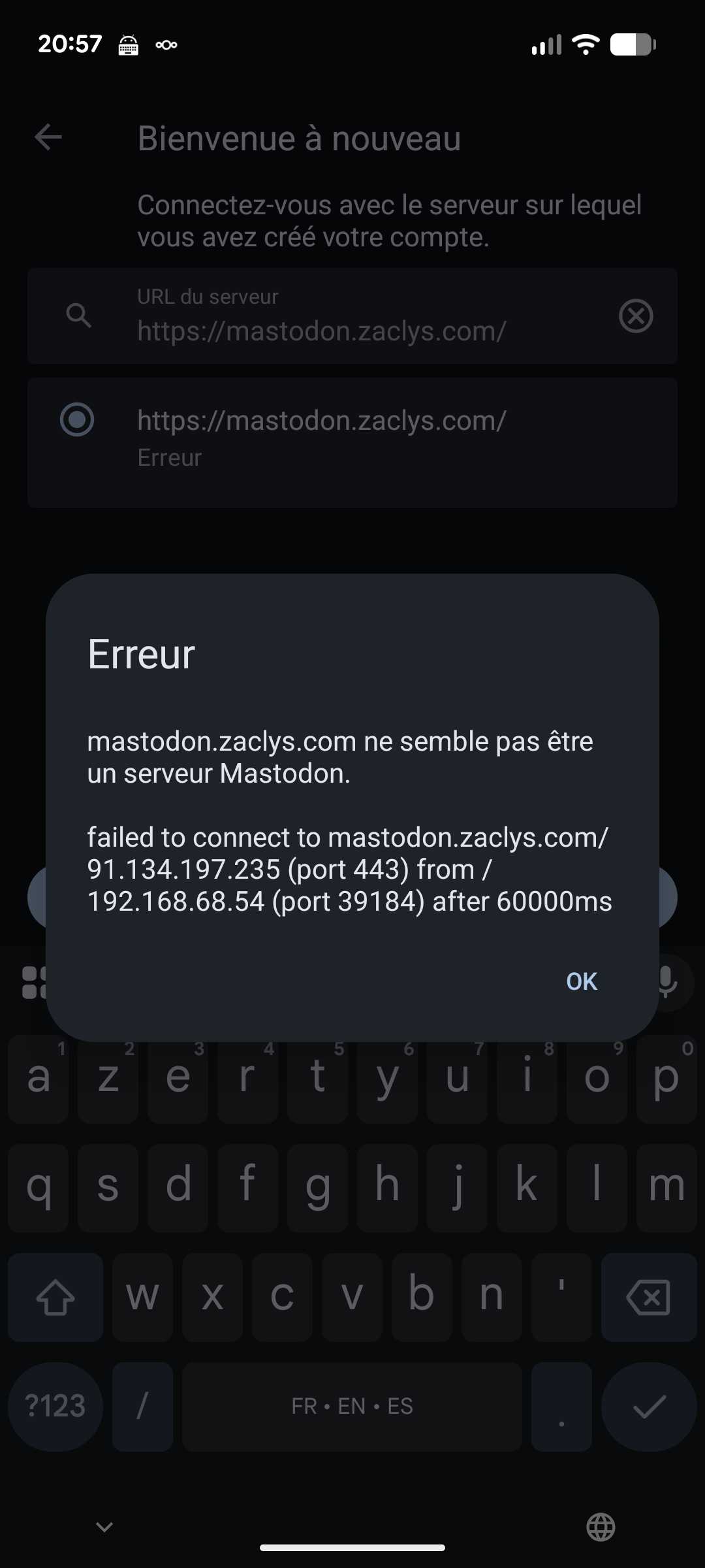 J'utilise l'application Tusky d'habitude, mais il n'y a pas de message d'erreur spécifique, donc voici une capture de ce que j'ai comme erreur quand j'ajoute le serveur sur l'app Mastodon: