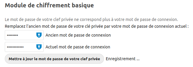 Dans les paramètres de cncloud, dans la partie Module de chiffrement basique, il est noté « Remplacez l'ancien mot de passe de votre clé privée par votre mot de passe de connexion actuel ».